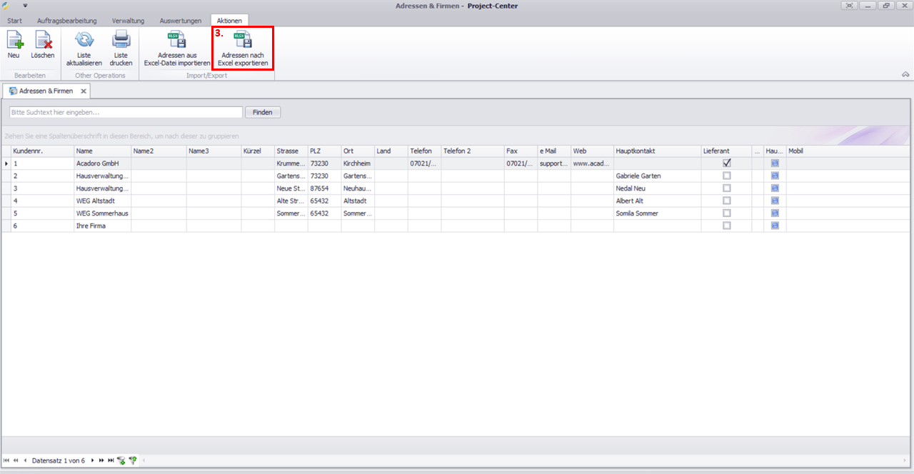 Es öffnet sich der Detail Reiter Adressen und Firmen, die Menüzeile wechselt auf Aktionen.Klicken Sie im Aktionsmenü auf Adressen nach Excel exportieren.