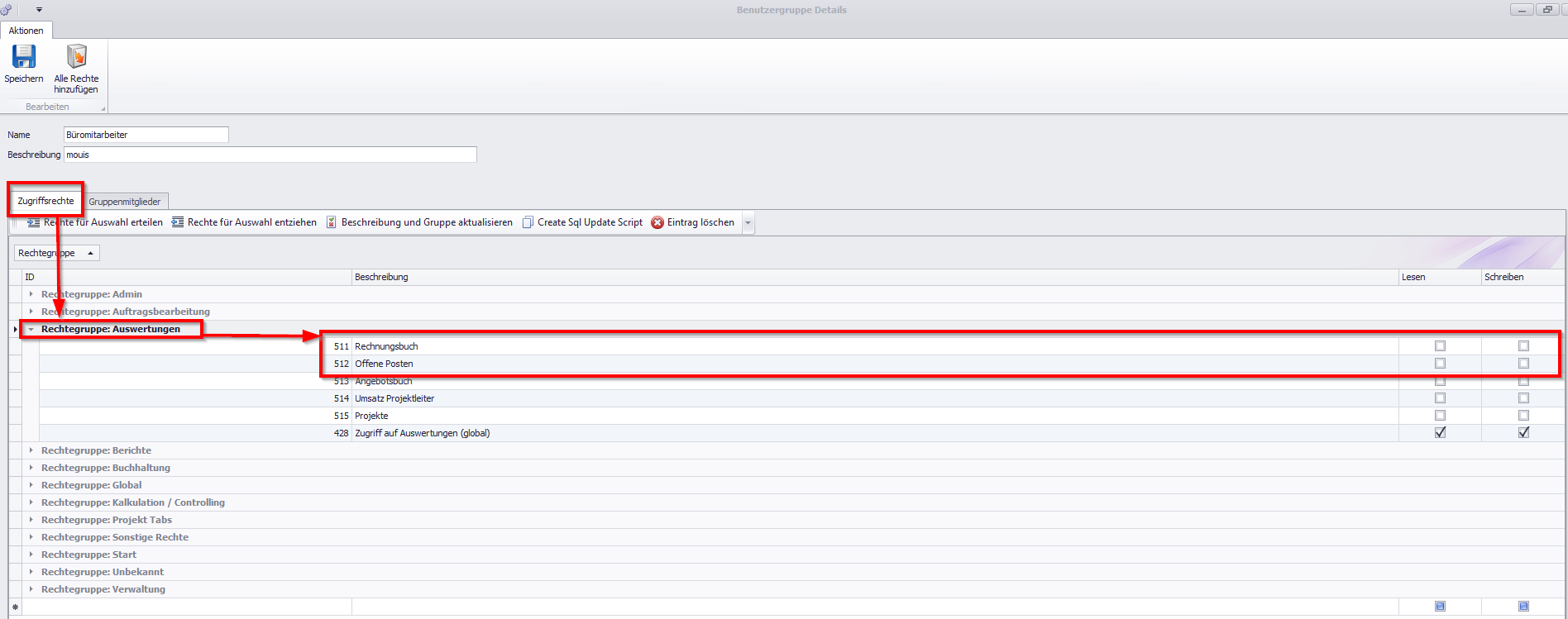 2. Nachdem Sie die passende Gruppe via Doppelklick geöffnet haben, gehen Sie hier in den Punkt "Rechtegruppe: Auswertung" unter dem Reiter "Verwaltung". Dort finden Sie die Punkte "Rechnungsbuch" und "Offene Posten" und können auf der rechten Seite die benötigten Rechte anhaken:
