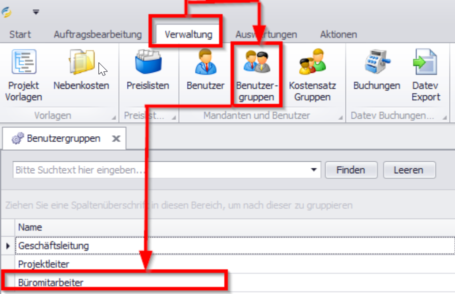 Wählen Sie den Reiter "Verwaltung", klicken dann auf "Benutzergruppen" und wählen im Anschluss die passende Gruppe aus.