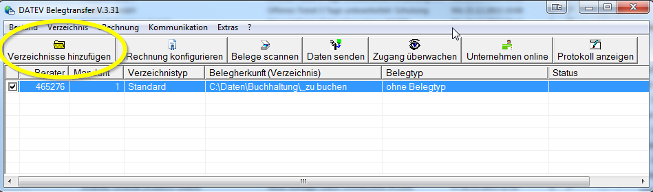 Konfigurieren Sie für diese Verzeichnisse im "Datev Belegtransfer" in Absprache mit Ihrem Steuerberater mit einem passenden Belegtyp.