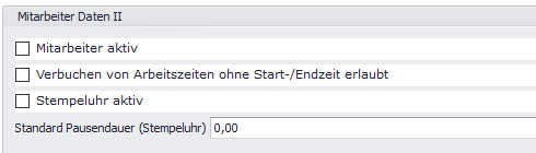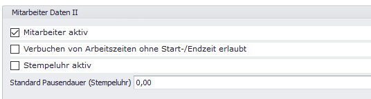 Klicken Sie im Bereich “Mitarbeiter Daten II” in den leeren Auswahlkasten “Mitarbeiter aktiv”.