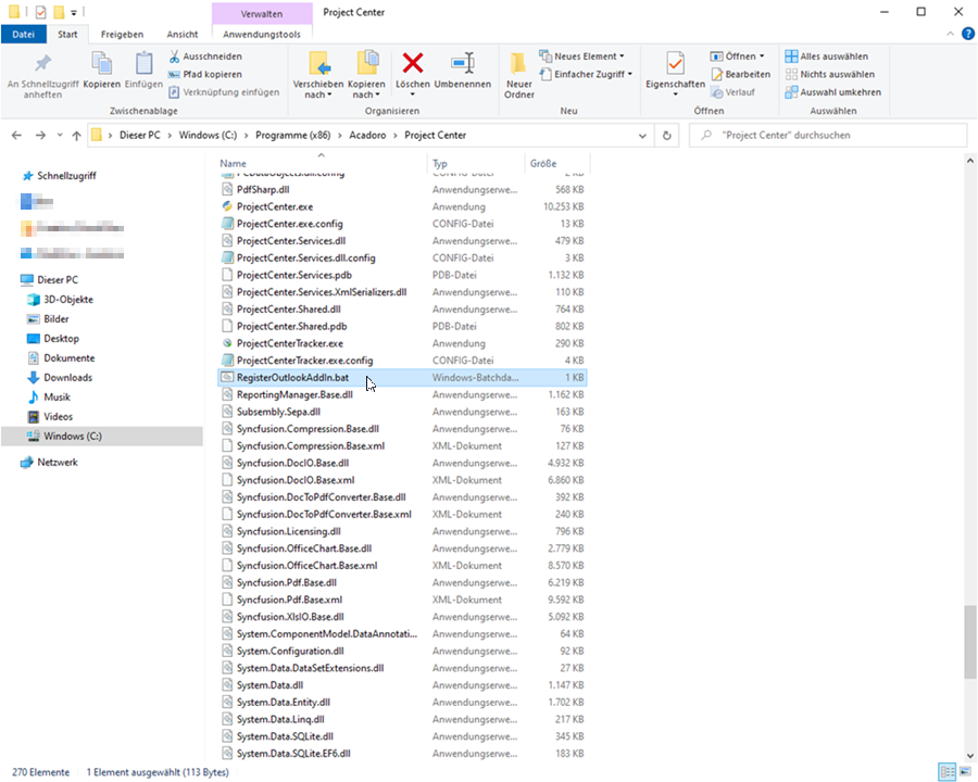 Öffnen Sie den Ordner Project Center und doppelklicken Sie auf die Datei RegisterOutlookAddIn.bat.