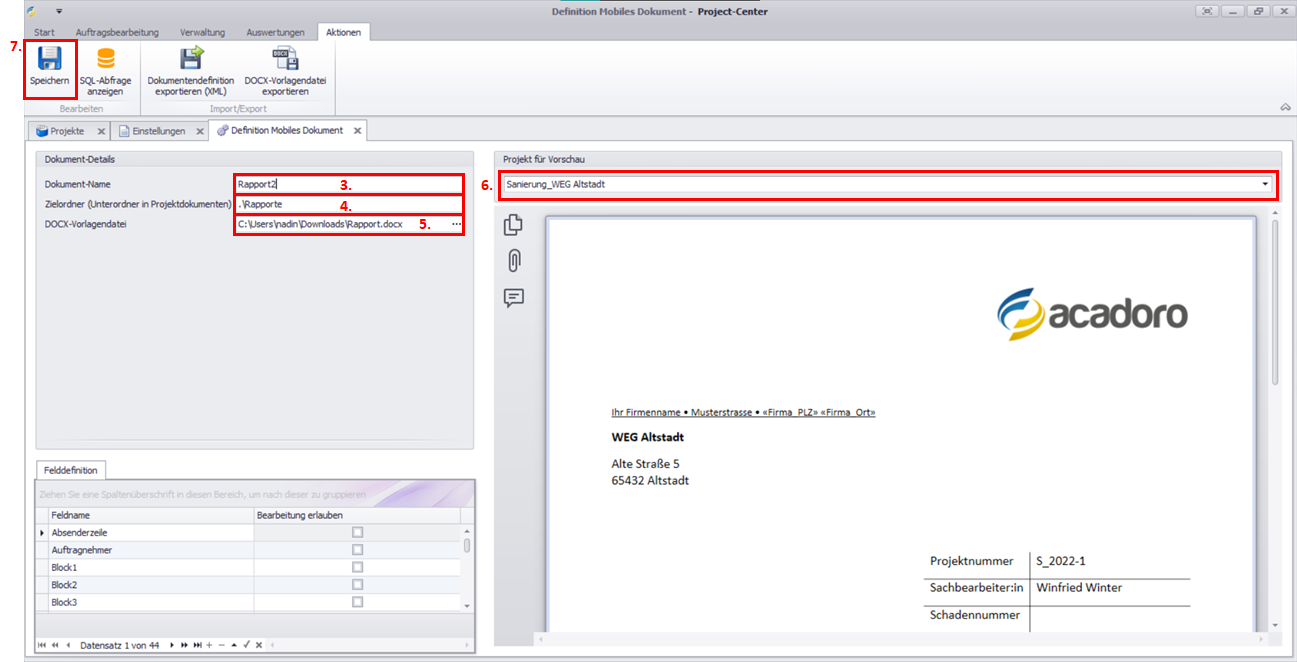 Weitere Informationen finden Sie unter DOCX-Vorlage erstellen und anpassen.Wählen Sie im Feld Projekt für Vorschau ein Projekt aus. Die Vorschau zeigt das erstellte Dokument anhand der Projekt- und Kundendaten des ausgewählten Projekts.