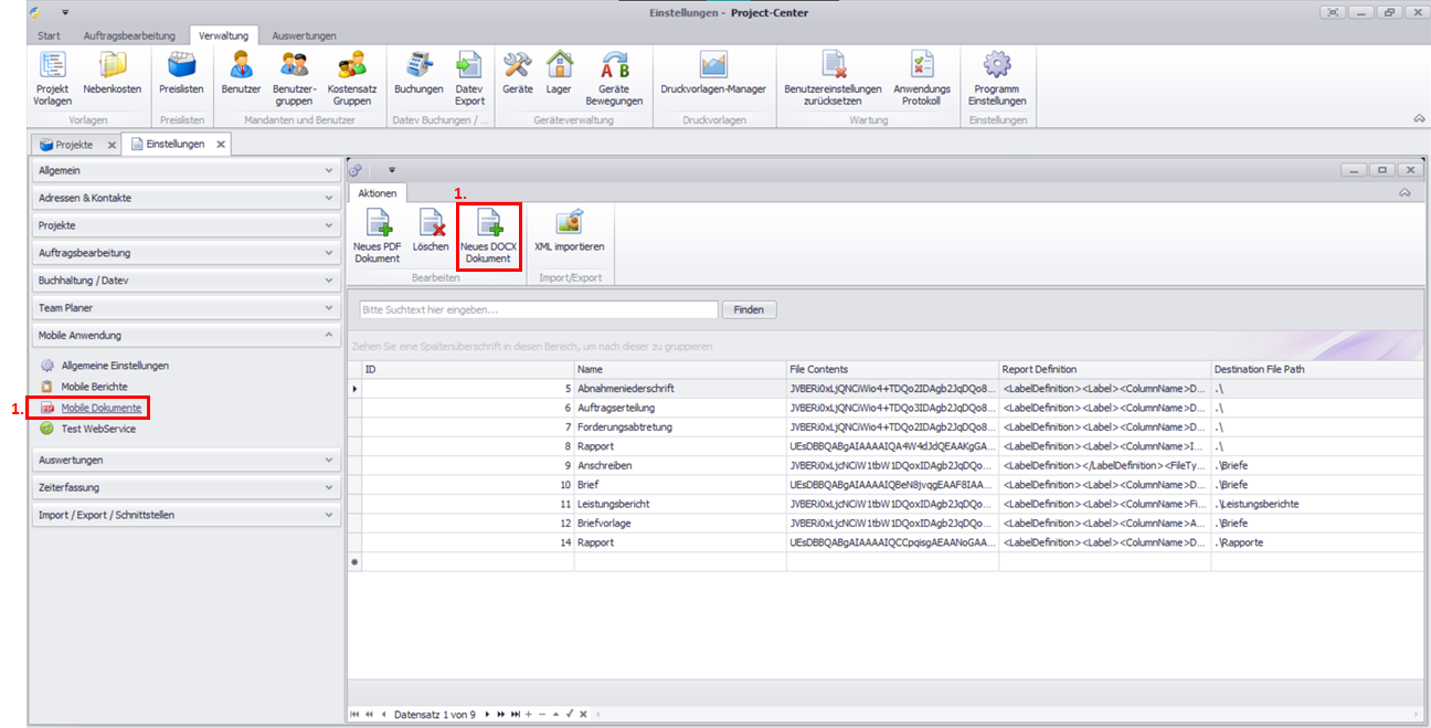 Nachdem Sie eine DOCX-Vorlage erstellt oder angepasst haben, importieren Sie die Vorlagendatei in Project-Center.