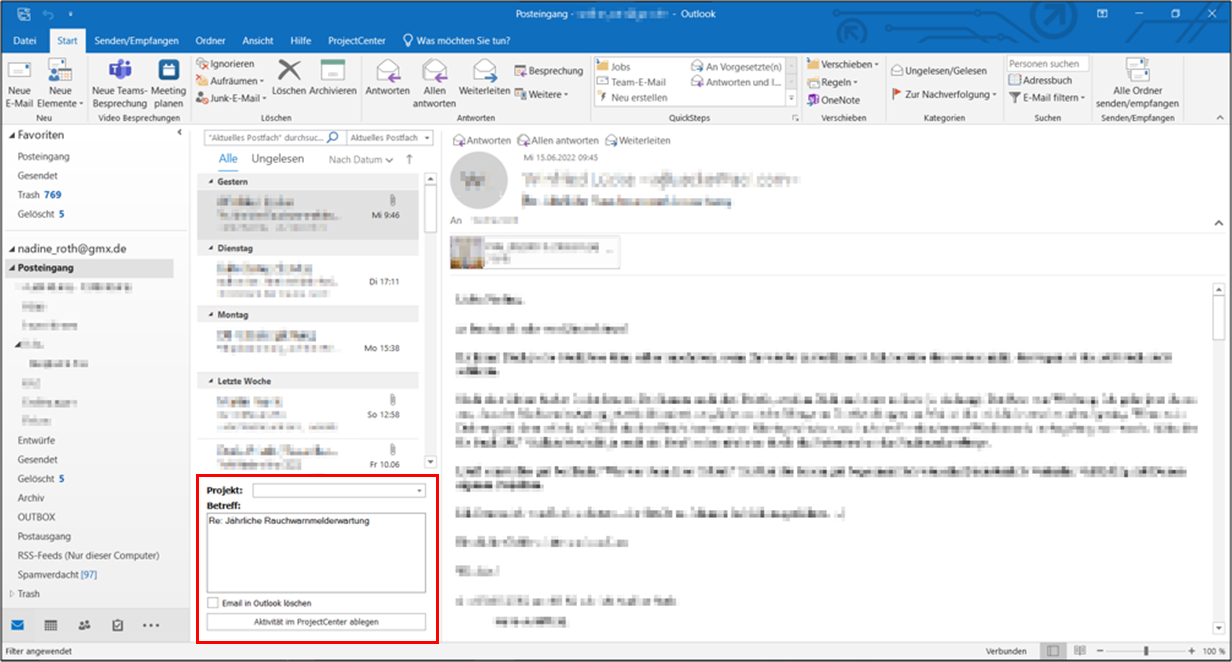 Am Ende der E-Mail Liste finden Sie das Outlook Add-Ins über das Sie eingehende und ausgehende E-Mails den entsprechenden Projekten zuordnen können, siehe dazu Outlook Add-In.