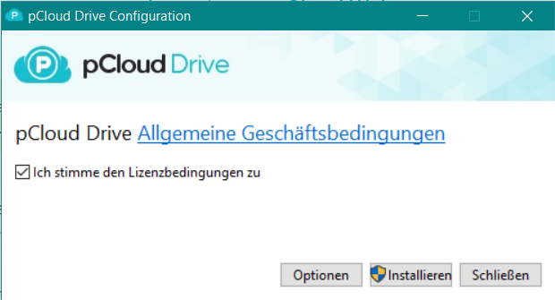 Es öffnet sich das Dialogfenster pCloud Drive Configuration.Aktivieren Sie das Feld Ich stimme den Lizenzbestimmungen zu.