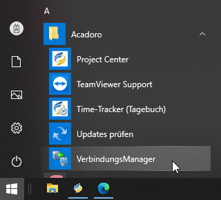 Hatten Sie den Project-Center-Client bereits im Einsatz und Ihre Server-URL hat sich geändert, können Sie den VerbindungsManager auch manuell aufrufen. Sie finden ihn im Windows-Startmenü unter Programme > Acadoro > VerbindungsManager. Abhängig von Ihrer Windows-Version könnte es z. B. so aussehen: