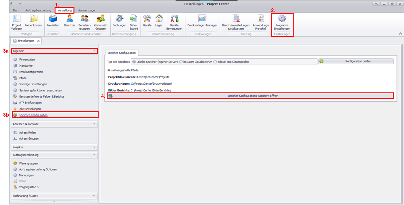 Über den Konfigurations-Assistenten können Sie den Speicherort und die Zugangsdaten hinterlegen und ändern.