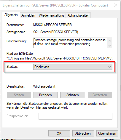 Wenn keine weiteren Datenbanken auf dem alten SQL-Server laufen, die Dienste entsprechend deaktivieren (rechte Maustaste → Eigenschaften):