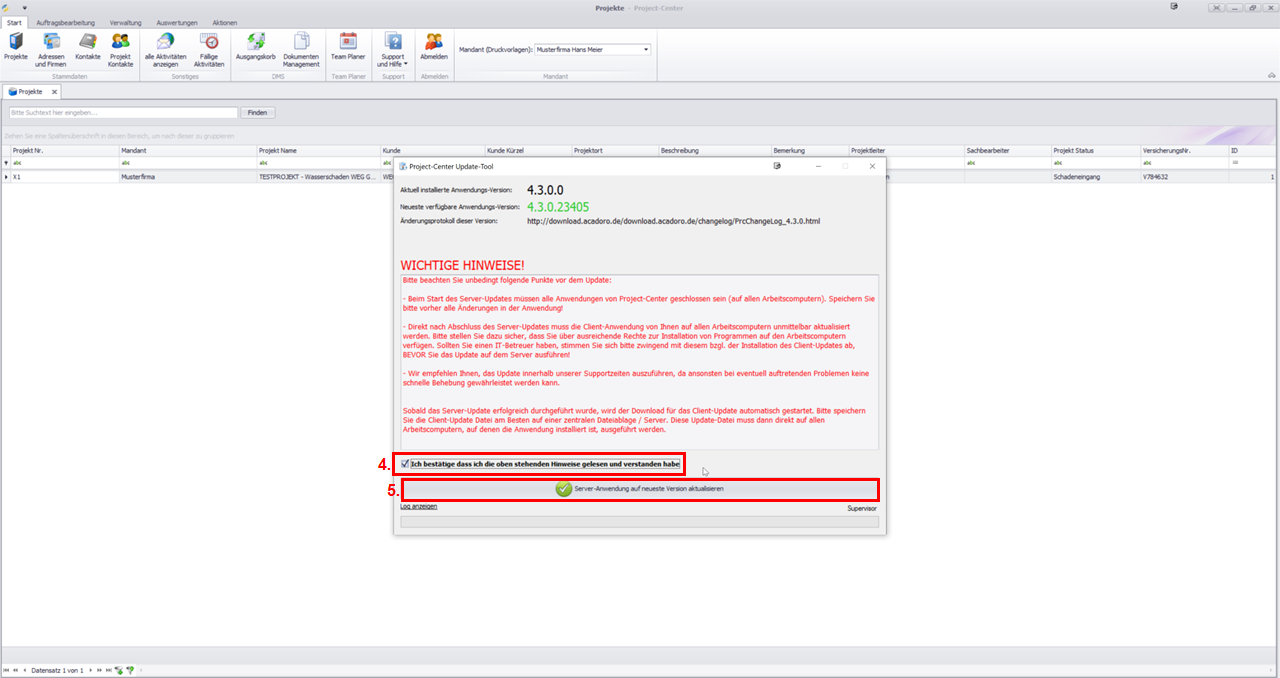 Es öffnet sich das Fenster Project-Center Update-Tool.Aktivieren Sie das Feld Ich bestätige, dass ich die oben stehenden Hinweise gelesen und verstanden habe.