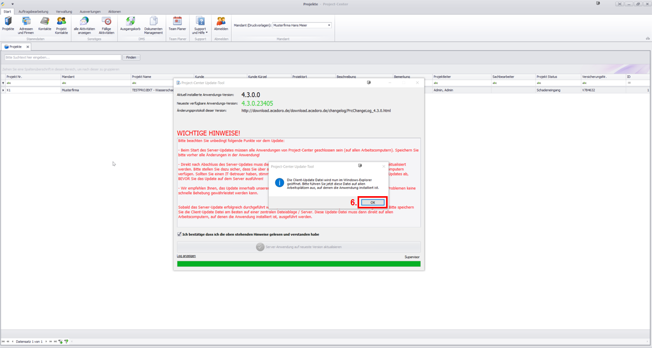 Weitere Informationen finden Sie unter Project-Center-Client aktualisieren.Führen Sie die Update-Datei auf allen Arbeitsplätzen aus, auf denen Project-Center installiert ist.