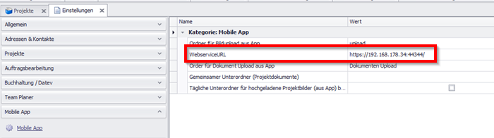 Verwenden Sie bei der Konfiguration der mobilen Anwendung die Webservice-URL, die auch bei den Desktop-Clients verwendet wird. Zur Einrichtung der mobilen Anwendung siehe Project-Center Mobile einrichten.