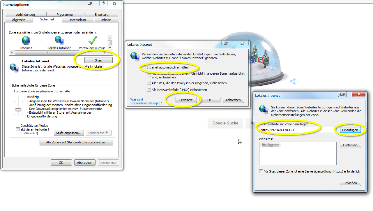 Klicken sie auf Zone "Lokales Intranet" und dort auf "Sites"
