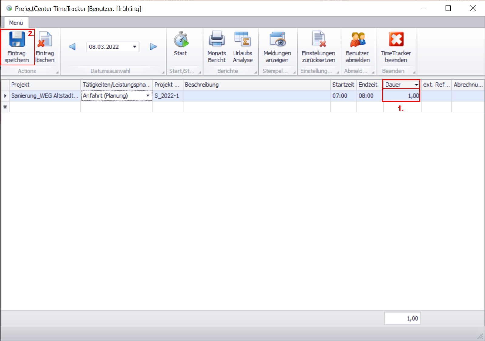45 min → 0,75 hKlicken Sie im Aktionsmenü auf Eintrag speichern.