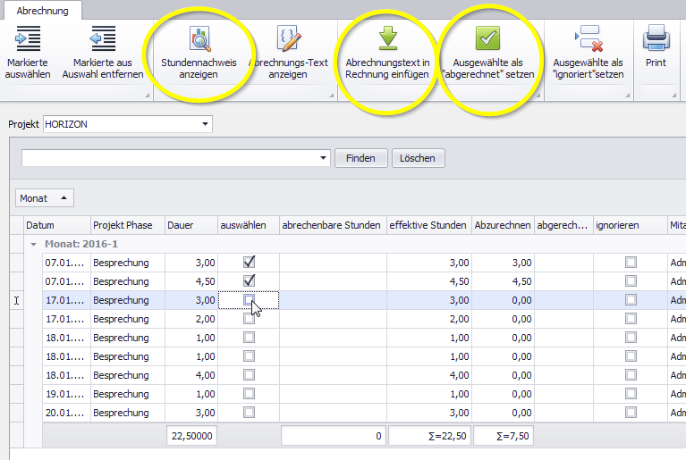 Zeiten die Sie nicht abrechnen wollen können Sie auf "Ignorieren" setzen und diese tauchen dann in der Liste der abzurechnenden Stunden nicht mehr auf.