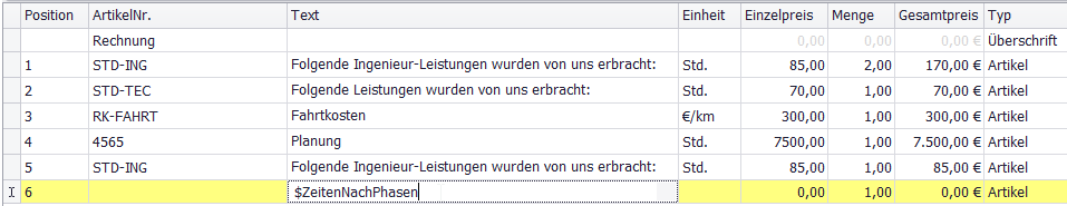 $ZeitenNachPhasen, um die Anzahl Arbeitsstunden nach Vorgänge bzw. Projektphasen aufzulisten.