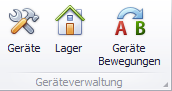 Die Geräteverwaltung teilt sich in Project-Center in die Menüpunkte “Geräte”, “Lager” und “Gerätebewegungen” auf. Das Menü finden Sie oben links in der Registerkarte “Verwaltung”.