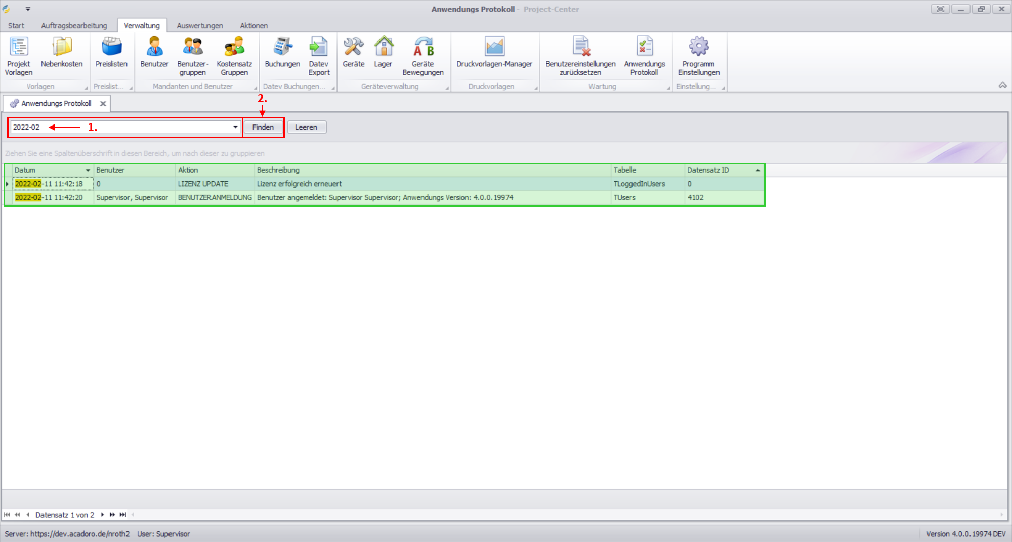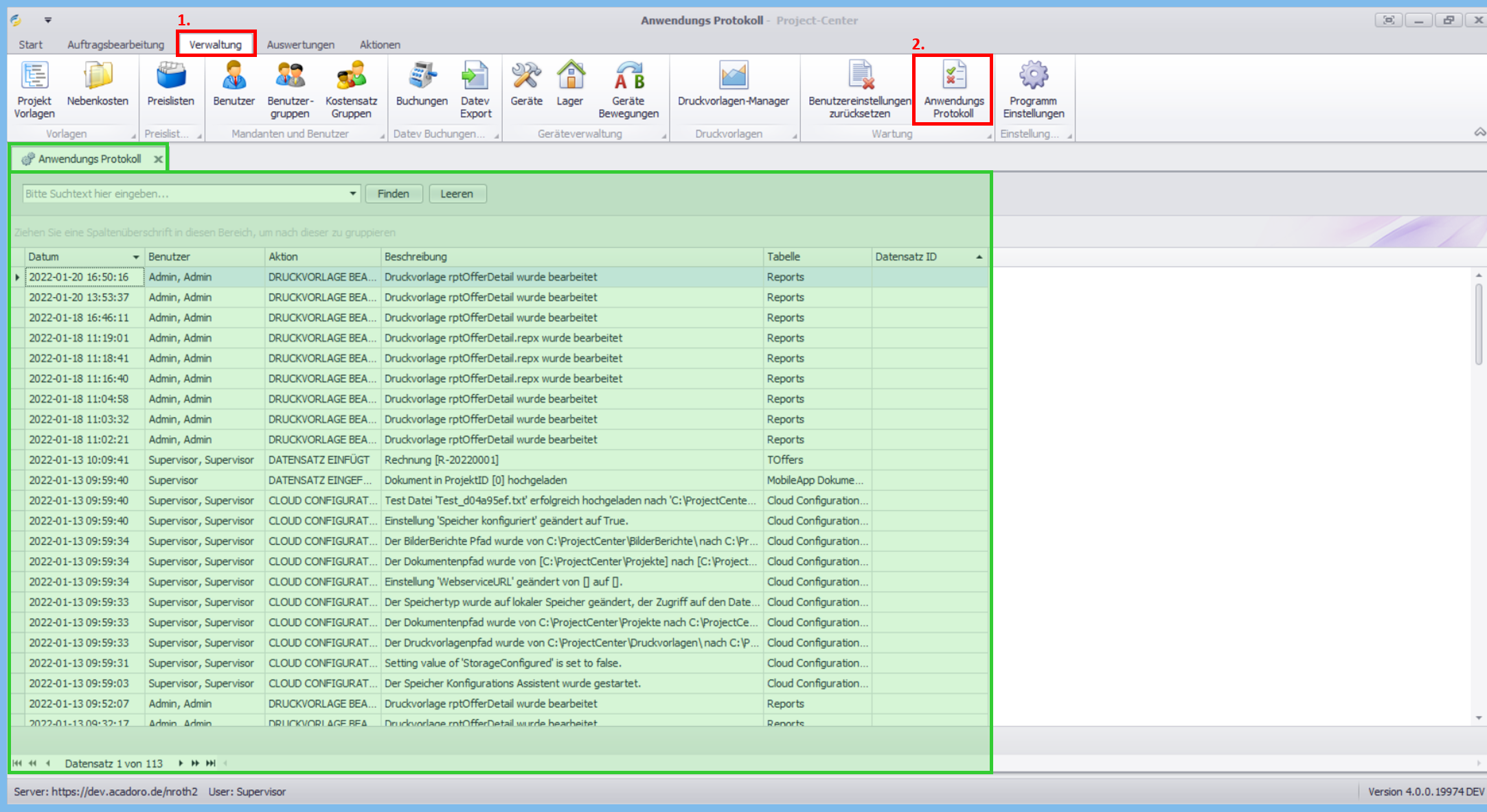 Im Anwendungsprotokoll finden Sie alle wichtigen Aktionen, die manuell oder vom System durchgeführt wurden:
