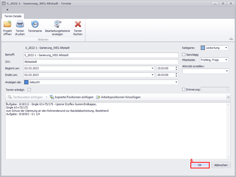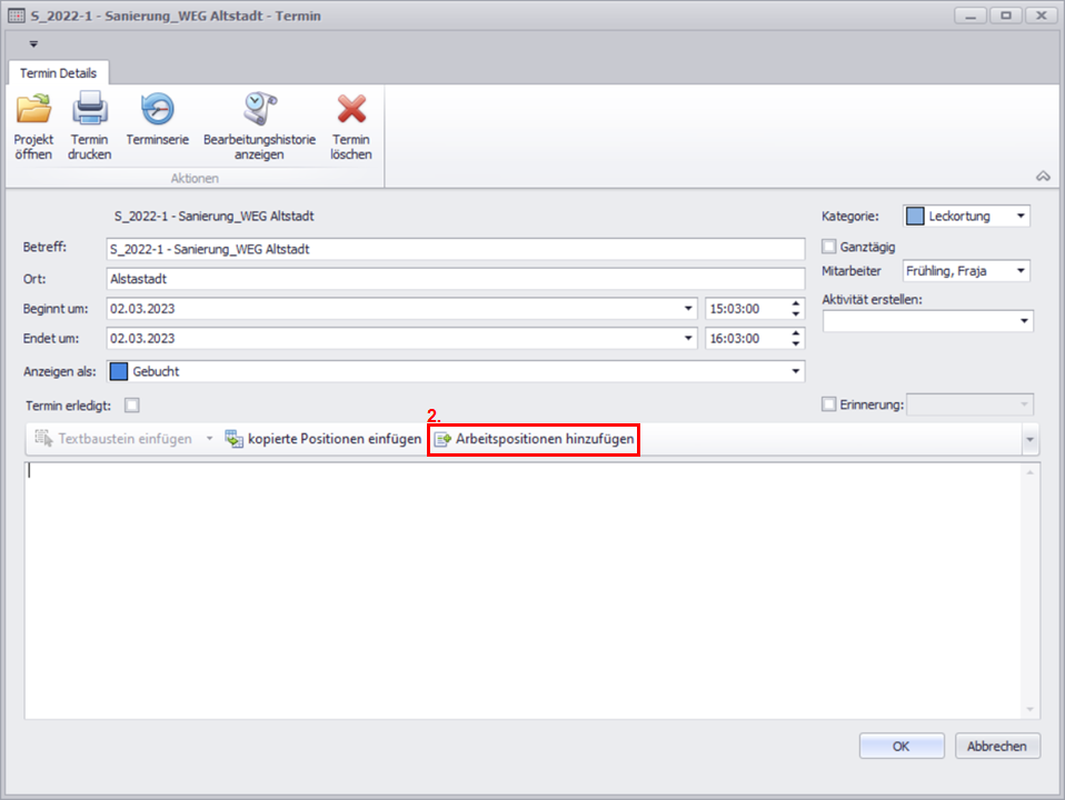 Das Fenster Arbeitspositionen wird geschlossen. Die Arbeitspositionen werden im Textfeld des Terminfensters hinzugefügt.Klicken Sie auf OK, um die Änderungen zu speichern.