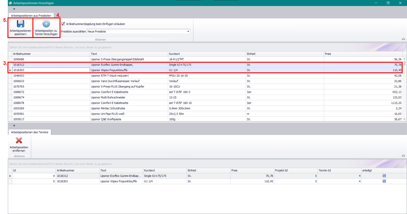 So hinterlegen Sie Arbeitspositionen in einem Termin