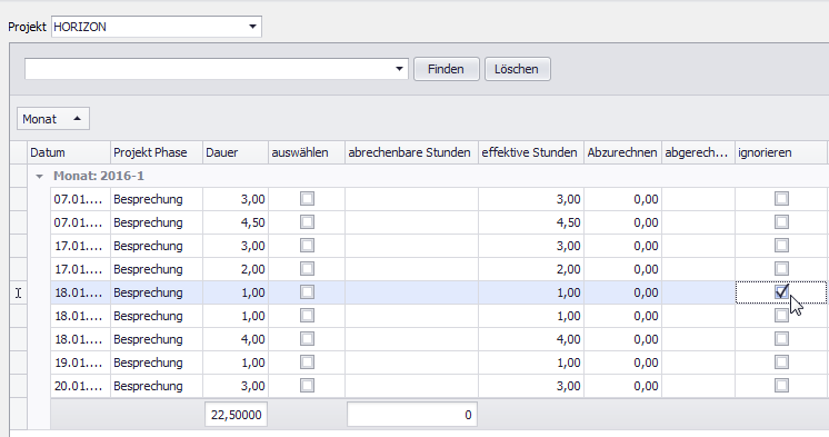 Sie können jeder Zeit wieder auf alle Arbeitszeiten dieses Projektes zugreifen und somit auch bereits abgerechnete oder ignorierte Arbeitszeiten wieder anzeigen.