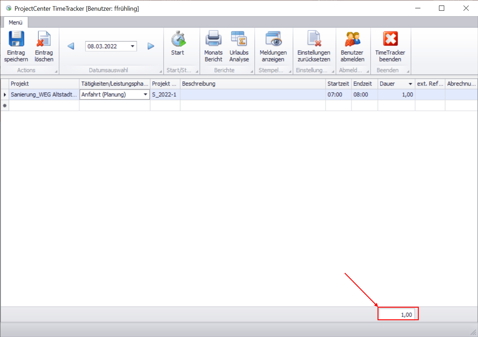 Nachdem Sie die Arbeitszeit erfasst und gespeichert haben, sehen Sie in der Summenleiste, die an diesem Tag geleisteten Stunden.