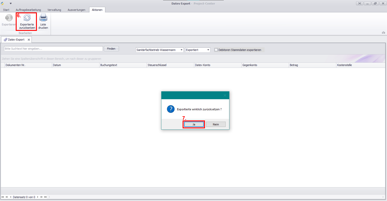 6. Klicken Sie im Reiter Aktionen im Aktionsmenü auf Exportierte zurücksetzen.