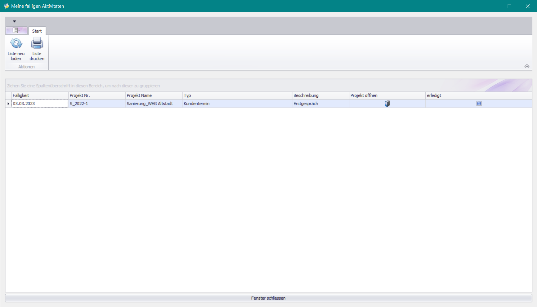 In der Übersicht Ihrer fälligen Aktivitäten können Sie die Aktivitäten als erledigt markieren und die zugehörigen Projekte öffnen.