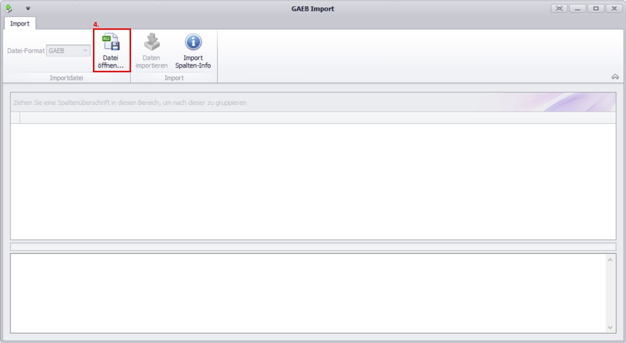 Es öffnet sich das Dialogfenster GAEB Import.Klicken Sie im Aktionsmenü auf Datei öffnen.