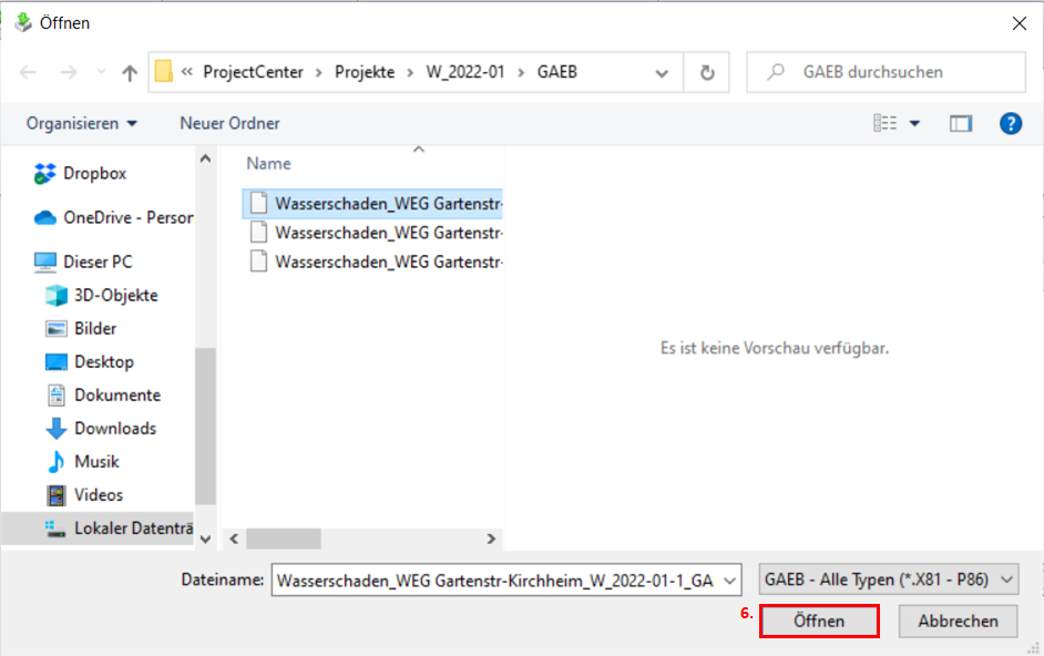Es öffnet sich der Datei-Explorer Ihres Betriebssystems.Navigieren Sie zum Speicherort der gewünschten GAEB-Datei und markieren Sie diese.