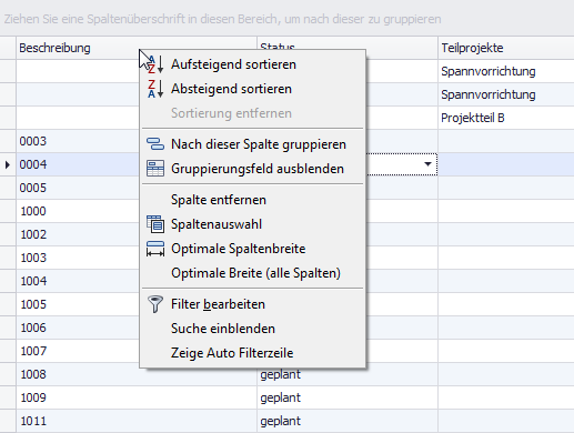 Die in Project Center an sehr vielen Stellen verwendeten Listenansichten bieten eine Vielzahl von Funktionen, um diese zu durchsuchen, anzupassen, zu sortieren oder zu filtern.