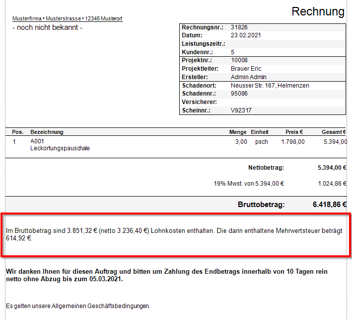 Dann ist diese Funktion bereits in Ihren Druckvorlagen enthalten. Die Textpassage zum Lohnkostenanteil ist jedoch standardmäßig ausgeblendet und muss zunächst eingeblendet werden, wenn Sie diese Funktion nutzen möchten. Gehen Sie dazu vor, wie hier beschrieben: