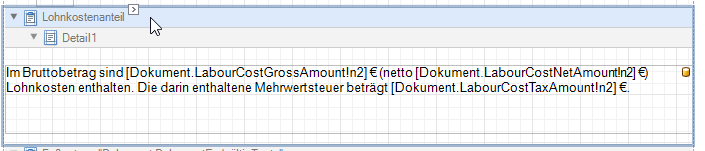 → Sie haben die geänderte Druckvorlage erfolgreich gespeichert. Wenn Sie nun ein Rechnungsdokument erstellen, wird die Textpassage zum automatisch berechneten Lohnkostenanteil in das Dokument integriert.