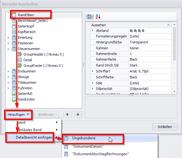 Wählen Sie aus dem Drop-Down-Menü den Eintrag “Detailbericht einfügen” und klicken auf “Ungebundene”.
