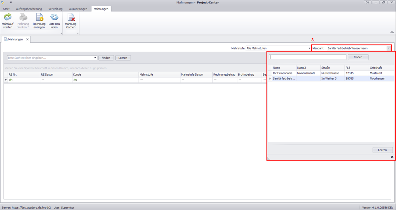 Wählen Sie im Feld Mandant die Firma/Niederlassung/Zweigstelle aus, für deren Kunden Mahnungen generiert werden sollen.