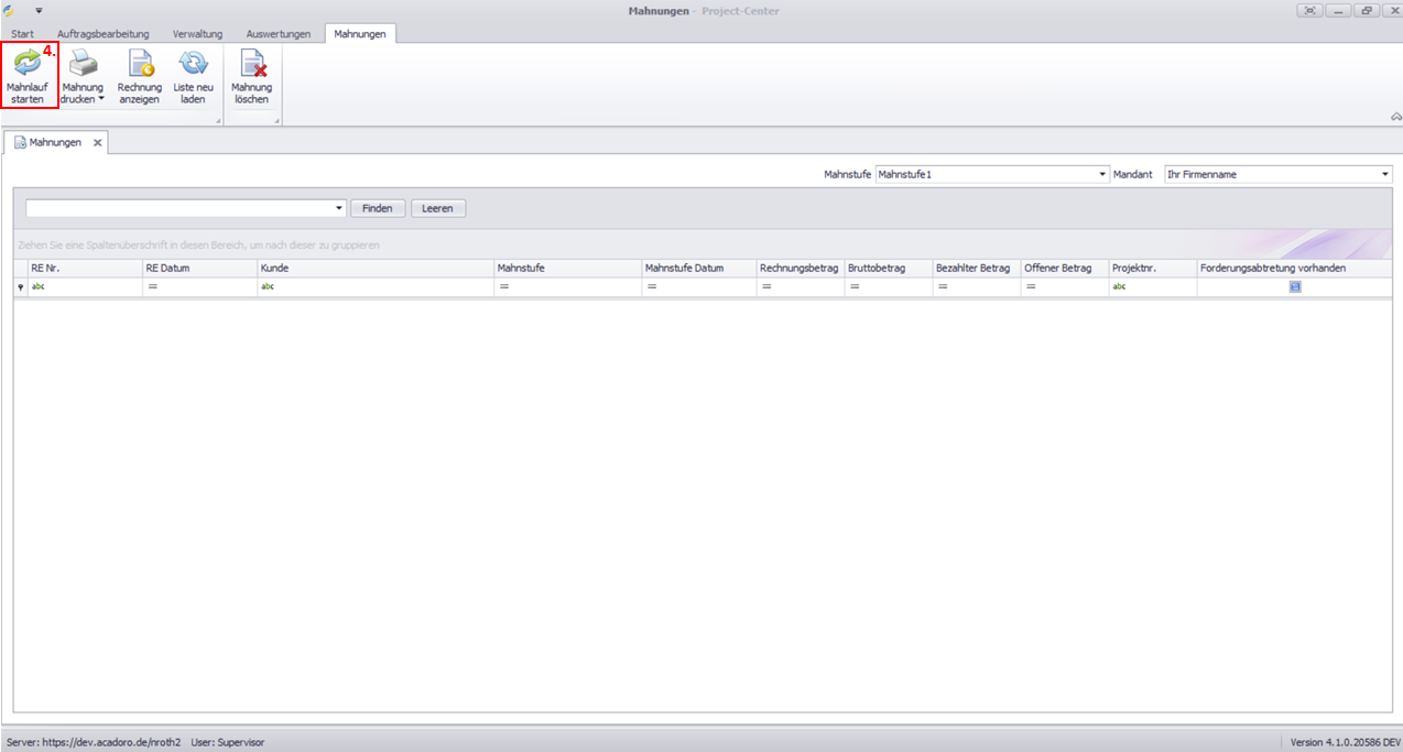 Klicken Sie im Aktionsmenü auf die Schaltfläche Mahnlauf starten.