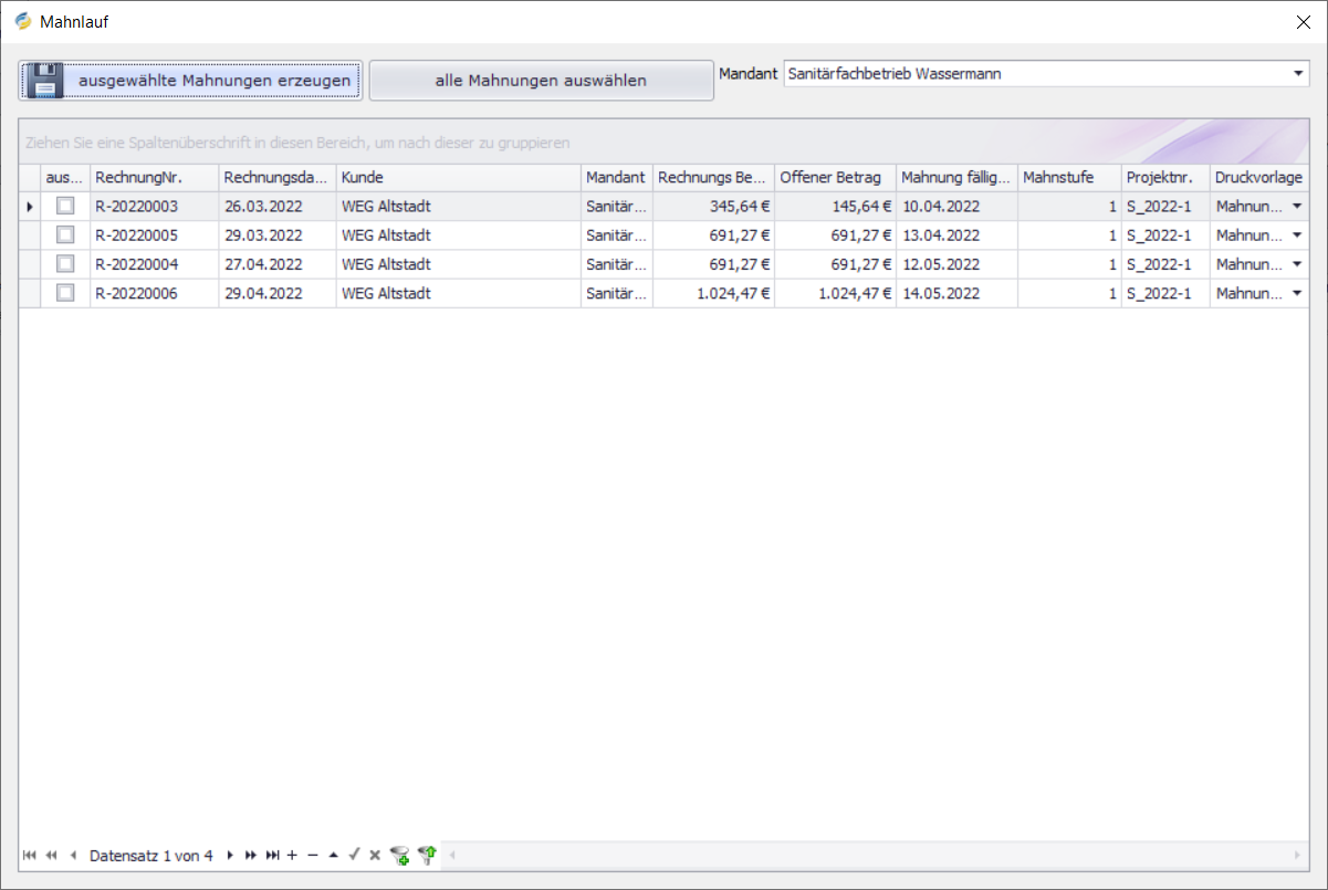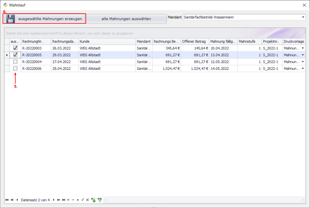Klicken Sie auf ausgewählte Mahnungen erzeugen.