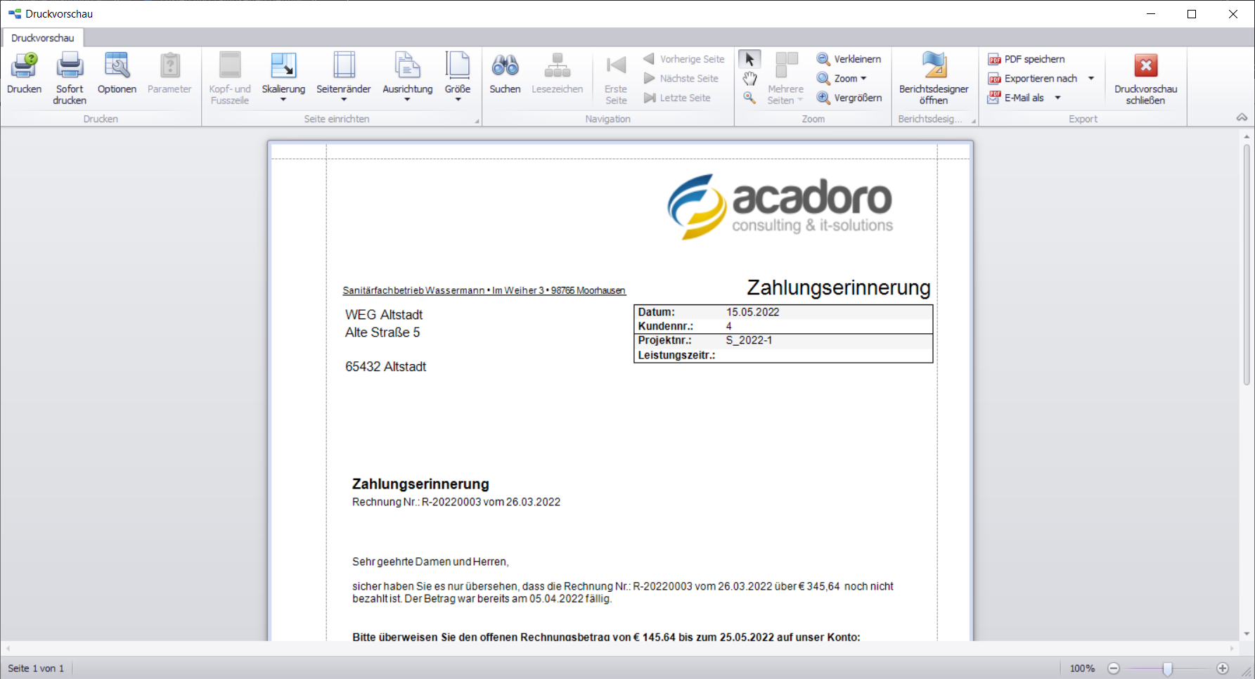 Für jede erzeugte Mahnung öffnet sich das Fenster Druckvorschau.