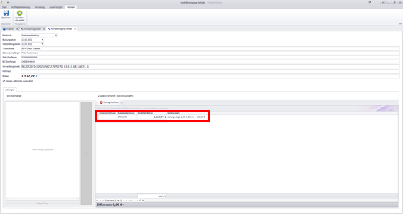 Der gezahlte Betrag wird in die Liste der Gruppe Zugeordnete Rechnungen übernommen.