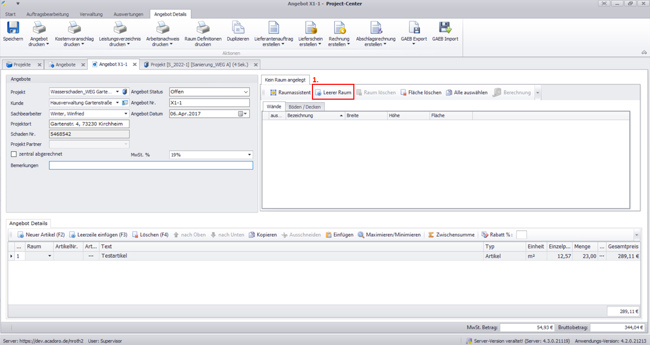 In der Gruppe Räume wird ein Reiter mit der gewählten Raumbezeichnung erstellt.