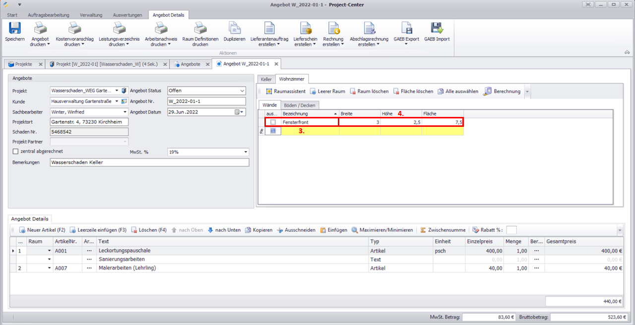 Klicken Sie im Reiter Wände in die erste freie Zeile und geben Sie in der Spalte Bezeichnung eine Bezeichnung der Fläche ein, z.B. Fensterfront.