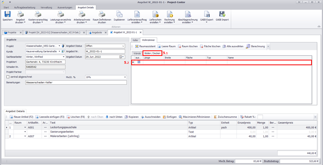 Wechseln Sie zum Reiter Böden/Decken und geben Sie die gewünschten Maße ein.