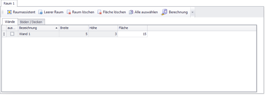 Tragen Sie in die Felder Breite und Höhe die Maße der Wände ein. Das Feld Fläche wird automatisch berechnet.