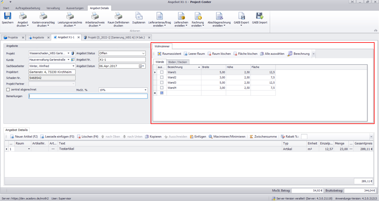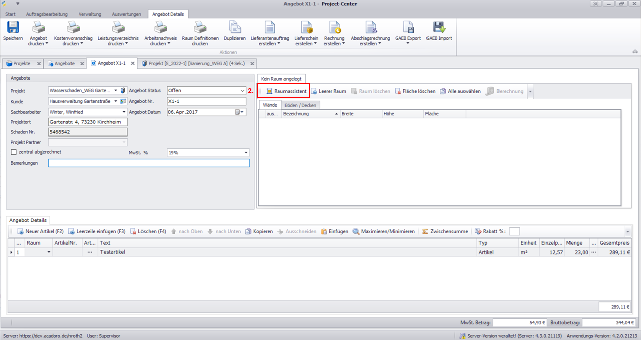 Öffnen Sie das Projektdokument (Angebot öffnen, Lieferschein, Rechnung), zu dem Sie einen Raum hinzufügen möchten.