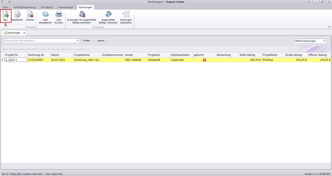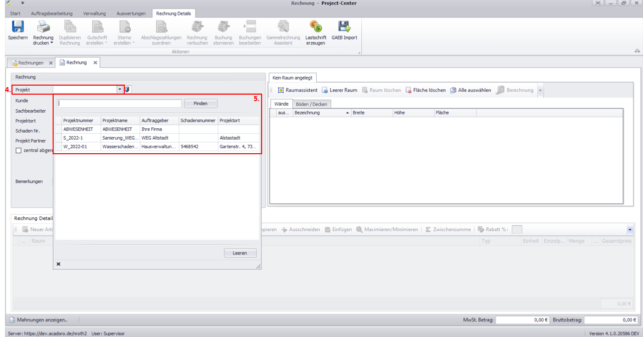Die Kunden- und Projektdaten werden in die Rechnung überführt.