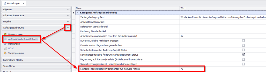 Wurden für einen Artikel keine Kostenanteile definiert oder wird in einer Rechnung manuell ein Artikel angelegt, wird der Standardprozentsatz für die Berechnung genutzt. Standardmäßig ist dieser auf 70% Lohnkostenanteil festgelegt. Um den Standardprozentsatz anzupassen, gehen Sie vor wie folgt: