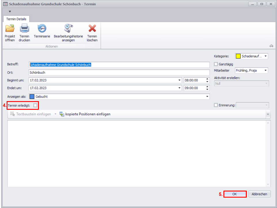 Setzen Sie im Feld Termin erledigt einen Haken.