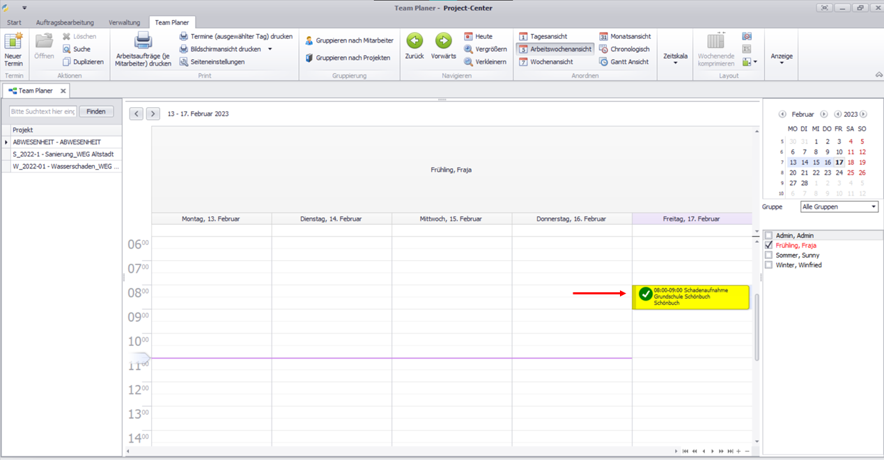 Das Fenster schließt sich. In der Kalenderansicht wird der Termin mit einem grünen Haken markiert.