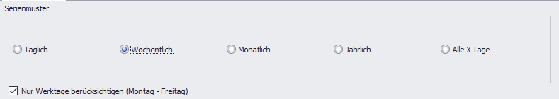 Deaktivieren Sie das Auswahlkästchen, wenn bei der Erzeugung der Serientermine auch Wochenendtage (Sa, So) berücksichtigt werden sollen. Ist das Auswahlkästchen aktiviert, werden nur Werktage (Mo-Fr) berücksichtigt.