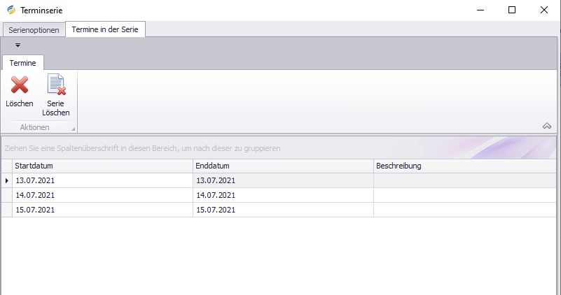 Um einen Überblick über die Terminserie zu erhalten, öffnen Sie mit einem Doppelklick einen beliebigen Termin aus der Serie, klicken Sie auf die Schaltfläche “Terminserie” und wählen Sie die Registerkarte “Termine in der Serie”. An dieser Stelle sehen Sie eine Auflistung aller Termine, die der Terminserie angehören.